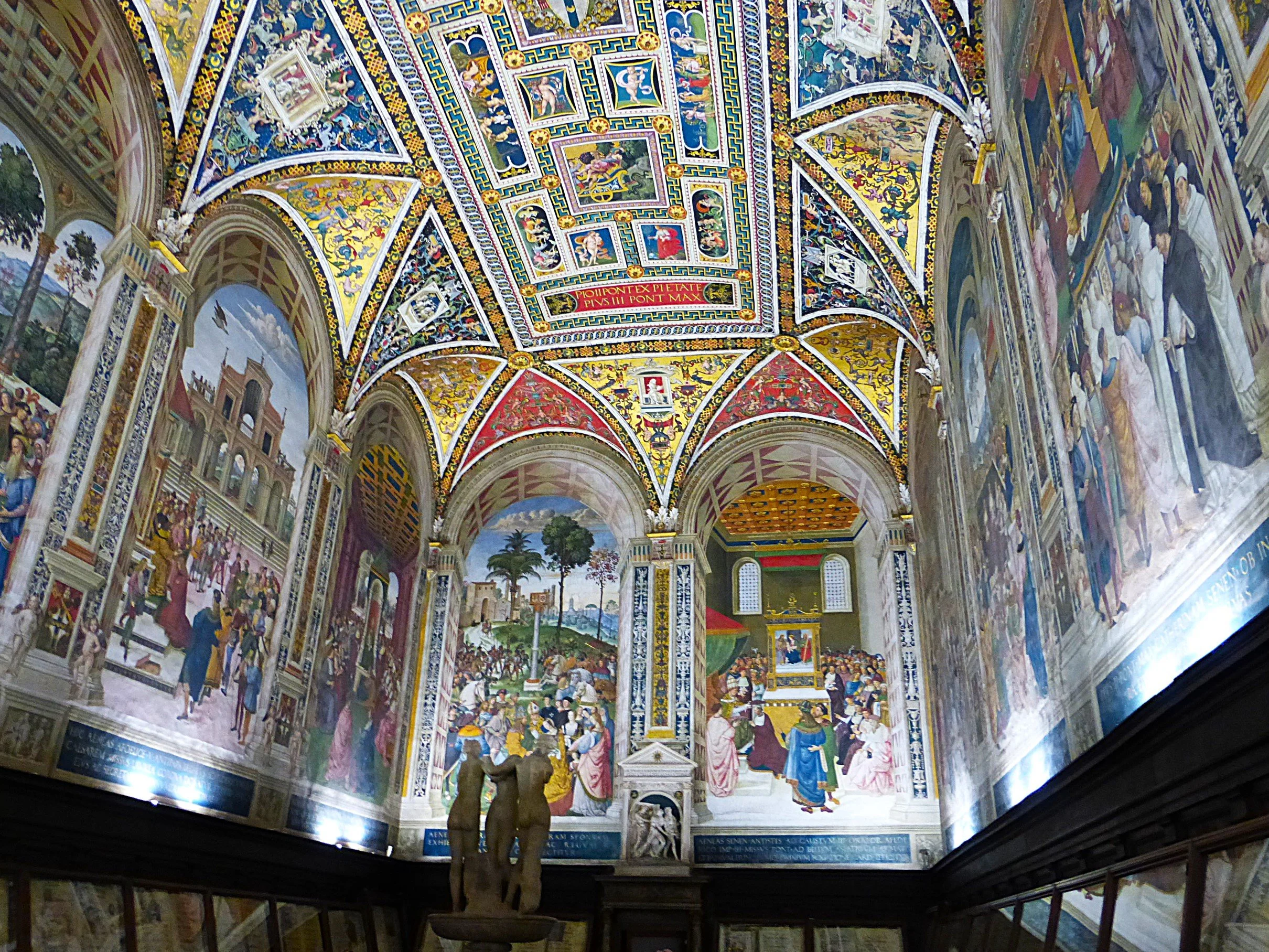 As Pope, his attempts to unite the squabbling Christian rulers against Ottoman advances into Europe failed, but he had success at church reform. He became a patron of the arts. He commissioned the architect Bernardo Rossellino to create an “ideal city” from his hometown, Corsignano, and renamed it Pienza. And in Siena’s Duomo, Pinturicchio’s frescoes, based on the “Commentaries,” tell Aeneas’ story in scenes as colourful as the man himself.