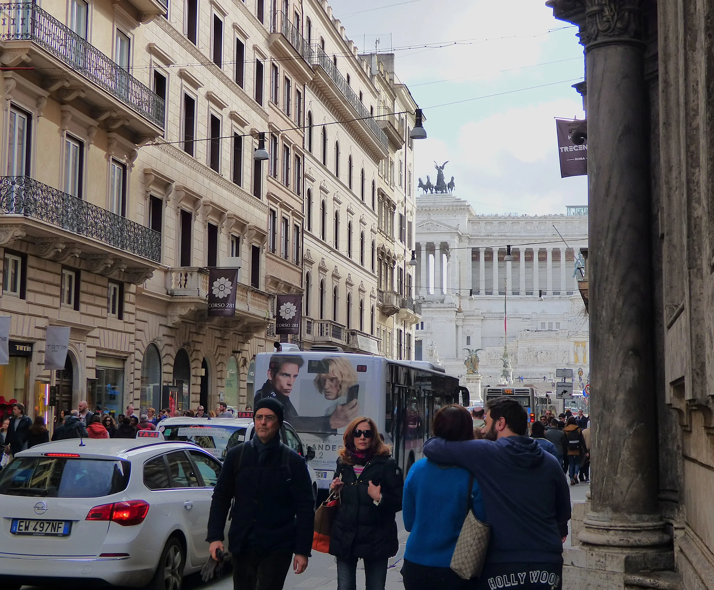 Via del Corso ends at Piazza Venezia and the giant Victor Emanuel II Monument