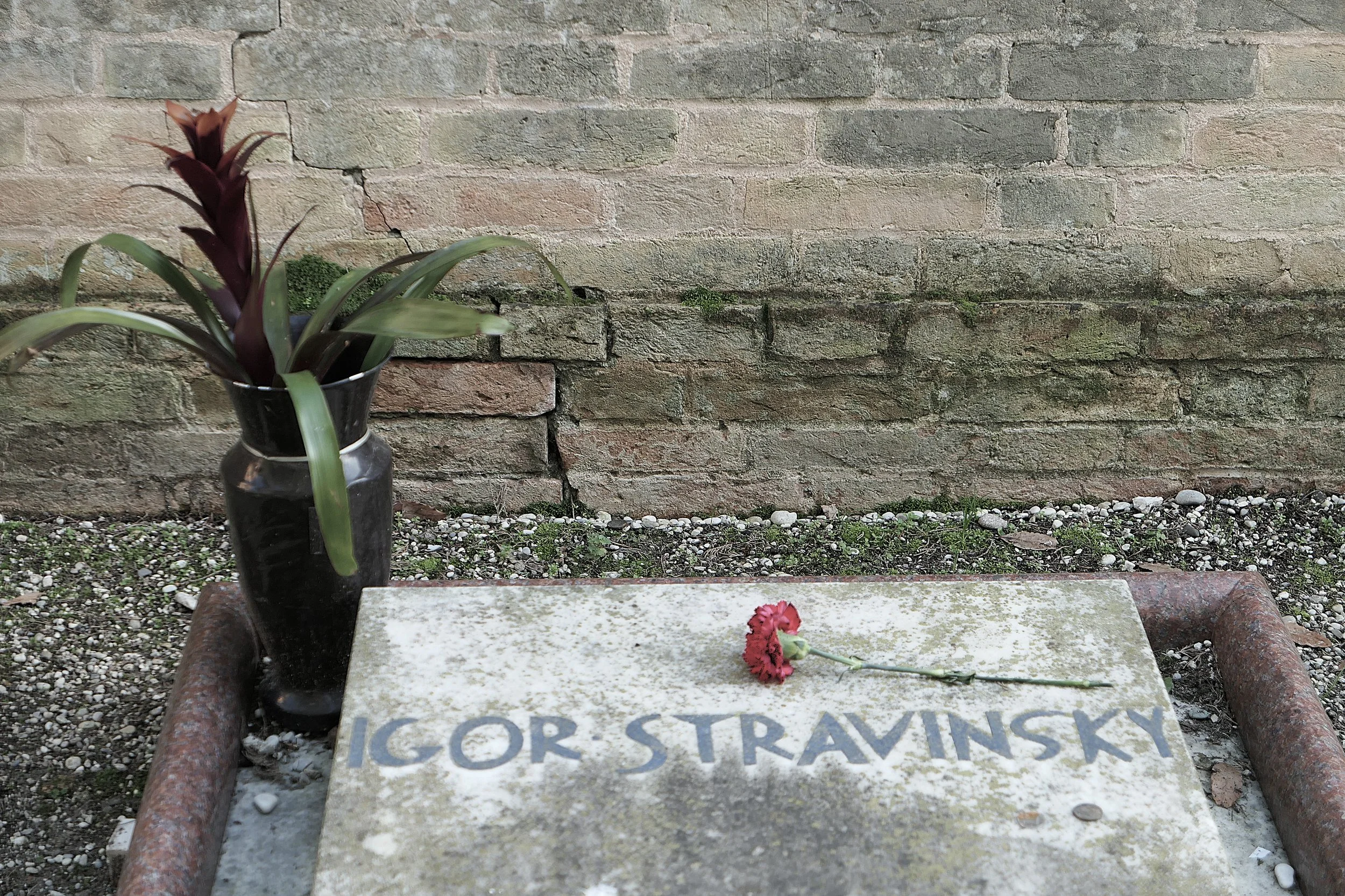 Igor Stravinsky, who wrote the music for both the Firebird and the revolutionary Rite of Spring ballets for Diaghilev, also had a solemn floating cortège in 1971, when his casket, heaped with flowers, was rowed by four gondoliers to San Michele. He was buried near Diaghilev, in the Orthodox section of the cemetery; and in 1982, his wife Vera’s gravestone was laid beside his. I found a fresh rose on each, and on his, a collection of pebbles in the shape of a treble clef.