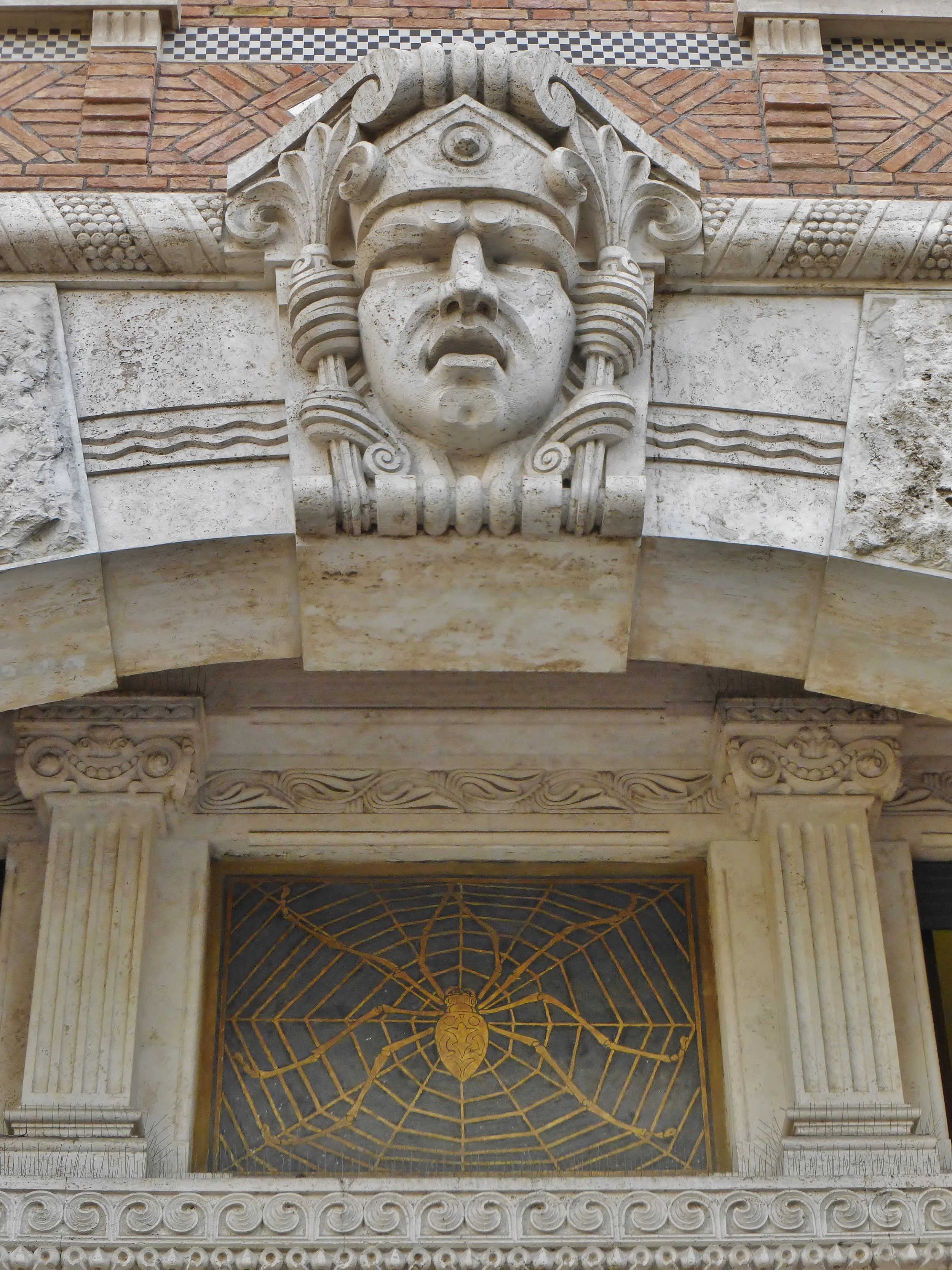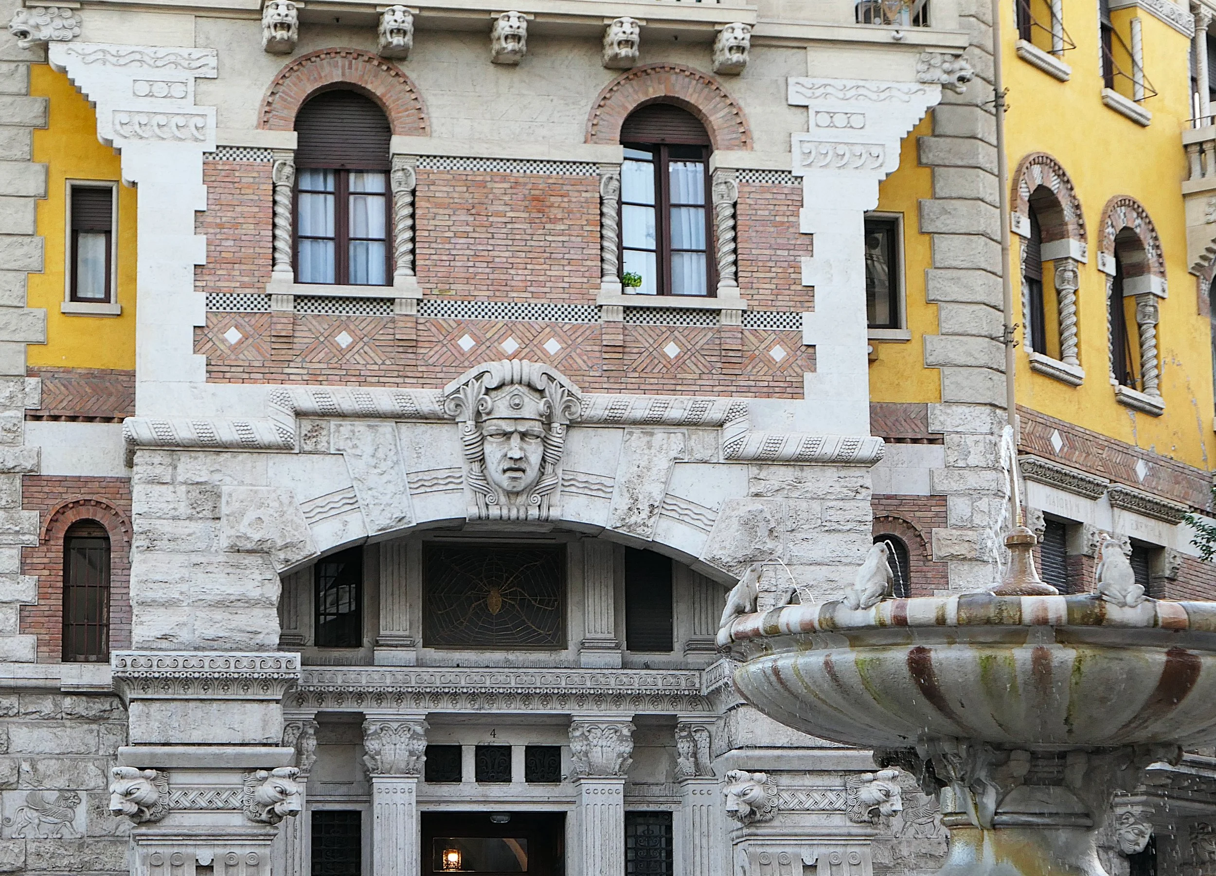 Across Piazza Mincio is the Palazzina del Ragno, the Palace of the Spiders, surprisingly harmonious in design, although constructed of brick, wood, stucco, marble, and stone. There is a stern marble mask of a king over the main entrance, as well as a menacing golden spider waiting within its web to greet you.