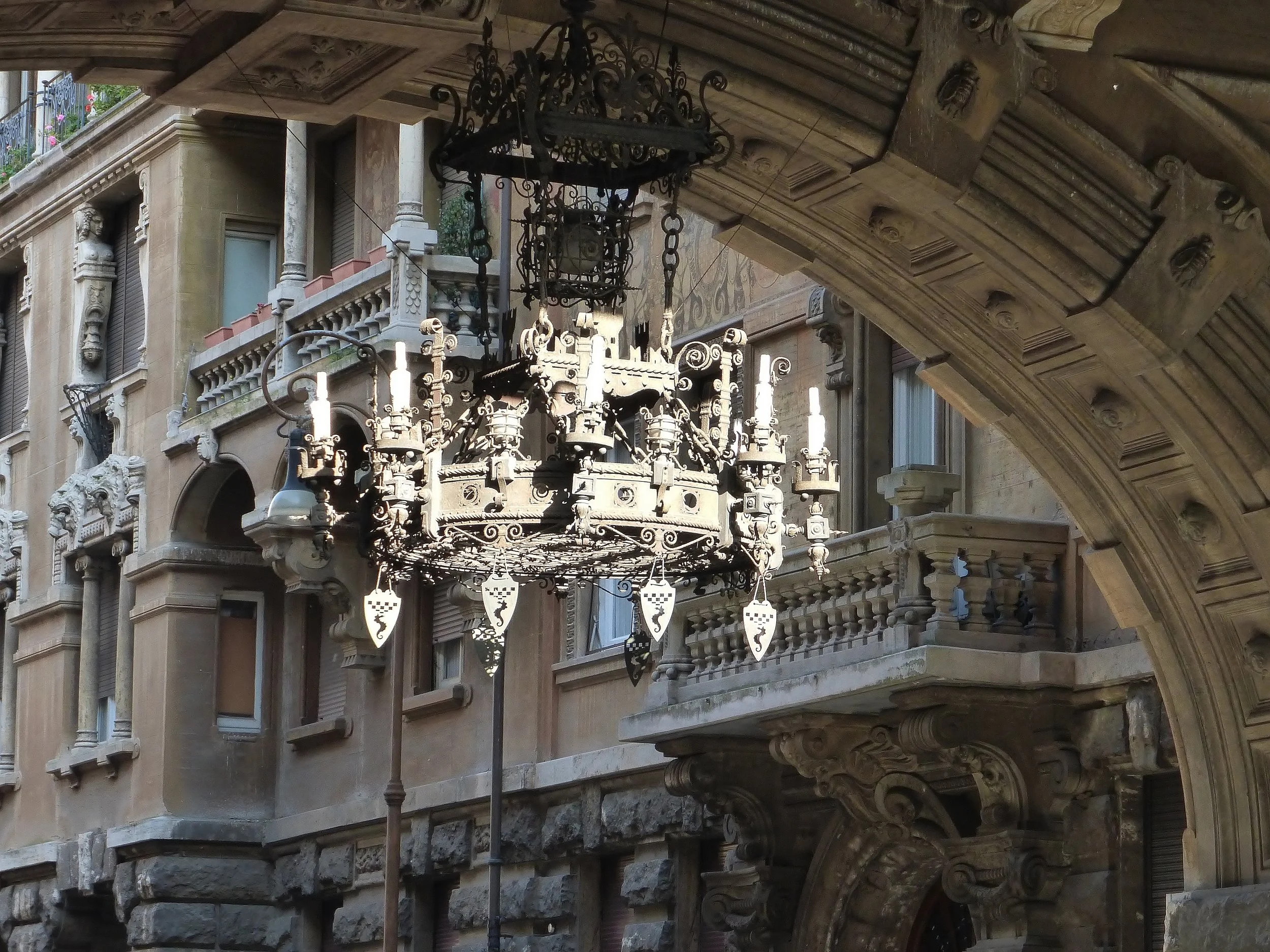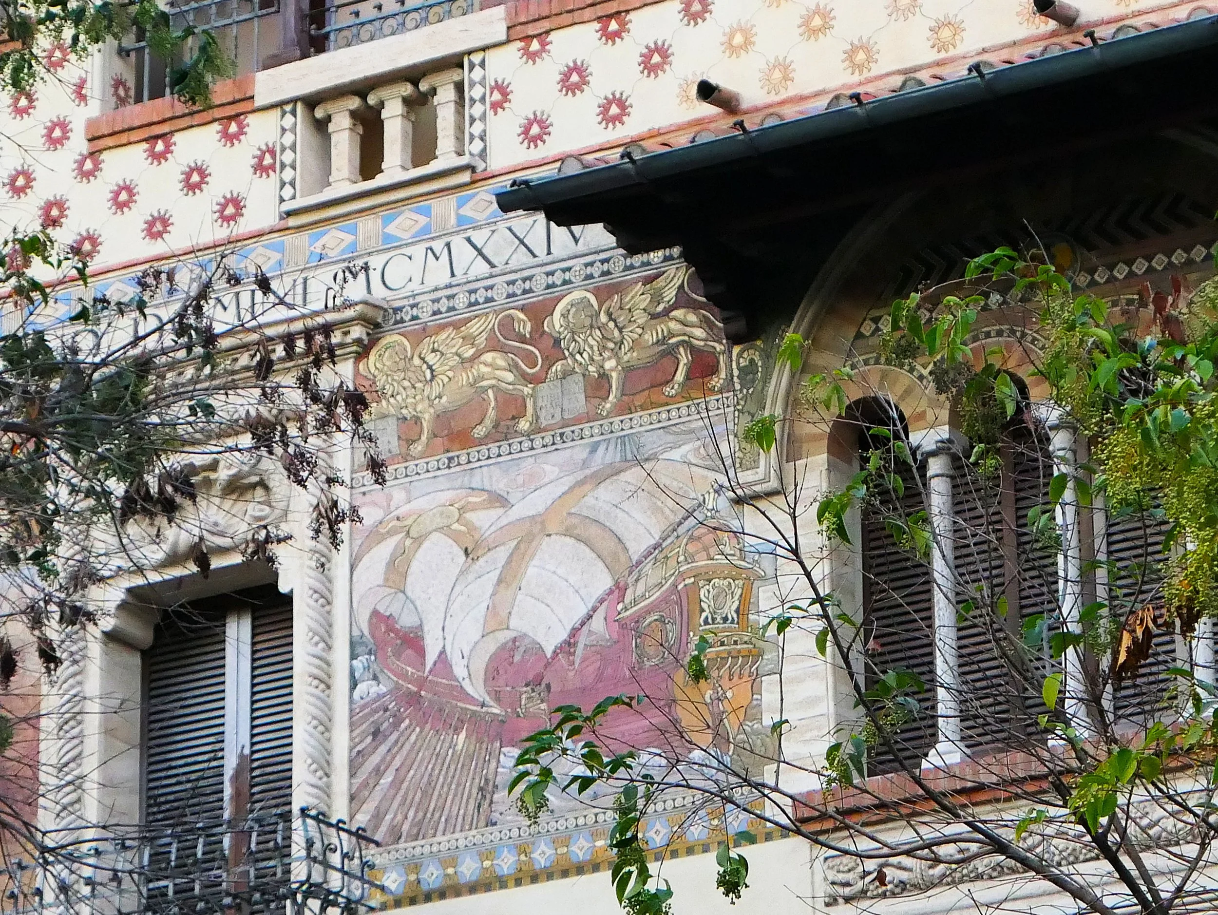 Coppedè’s commission gave him considerable freedom, and he exploited it with gusto. He created palazzi and villas in a bewildering (and rather bewitching) multitude of styles, about 40 structures in all, around the area of Via Tagliamento and Via Dora. He loved ornamentation, and applied it exuberantly. Under a grand entrance arch, decorated with a huge, forbidding mascherone (sculpted face), and a frieze of garlands and Greek masks, hangs an enormous art-deco wrought-iron chandelier. On either side of the arch are towers of the Palazzo degli Ambasciatori, a large apartment block. The facades are encrusted with mannerist nudes, Romanesque and Renaissance loggias, Baroque balcony corbels, and medieval grotesques – all in travertine or marble.