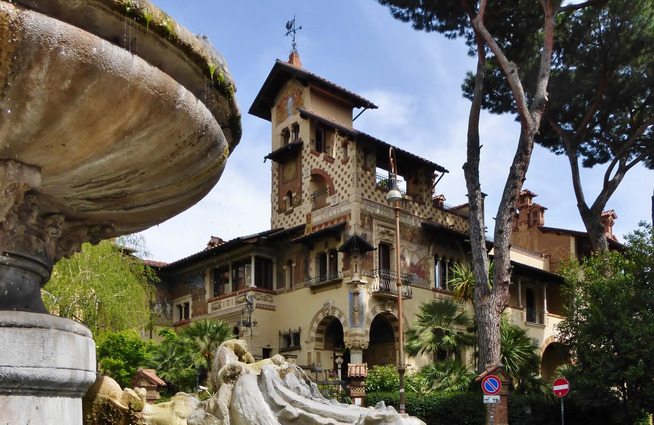 Even more striking is the Villino delle Fate, the House of the Fairies, which is framed by the arch as you look past the fountain. I can’t begin to tell you the derivation of its form, but it really doesn’t matter. There are loggias, brick arches, half-arches, columns with capitals of every classical order and more. There are tiles, statues, a relief of the Capitoline wolf, art-nouveau wrought-iron balconies, a working sundial, and walls painted with images of Venetian galleys, Florentine cityscapes, Dante and Boccaccio.