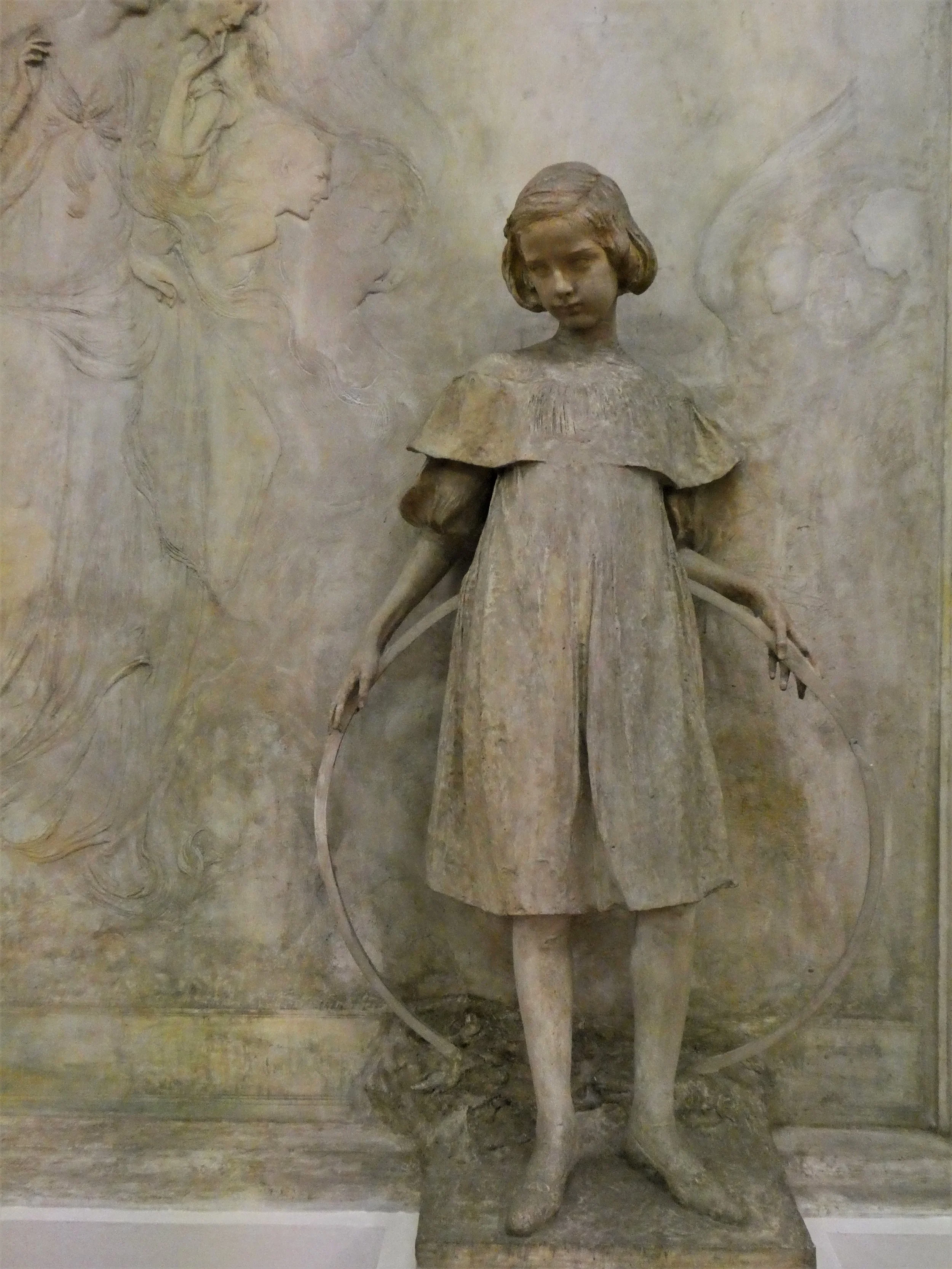 Nevertheless, Canonica’s work still can be found around the world, in Britain, Holland, Turkey, Colombia, Argentina, Egypt, Russia and the Vatican – and, of course, Italy. But heroic monuments are not the only works on display in the palazzo. There are dozens of portrait busts of aristocrats and others, all utterly believable. Queen Alexandra and King Edward VII are there, in bronze copies of marble portraits now in Buckingham Palace and Osborne House respectively. His portrait of Princess Emily Doria Pamphilj, a great beauty, is breathtaking. There are religious works of passionate intensity, some intriguing allegorical pieces, and several funerary memorials. One for Laura Vigo, a child who died in Turin around 1908, is especially moving.