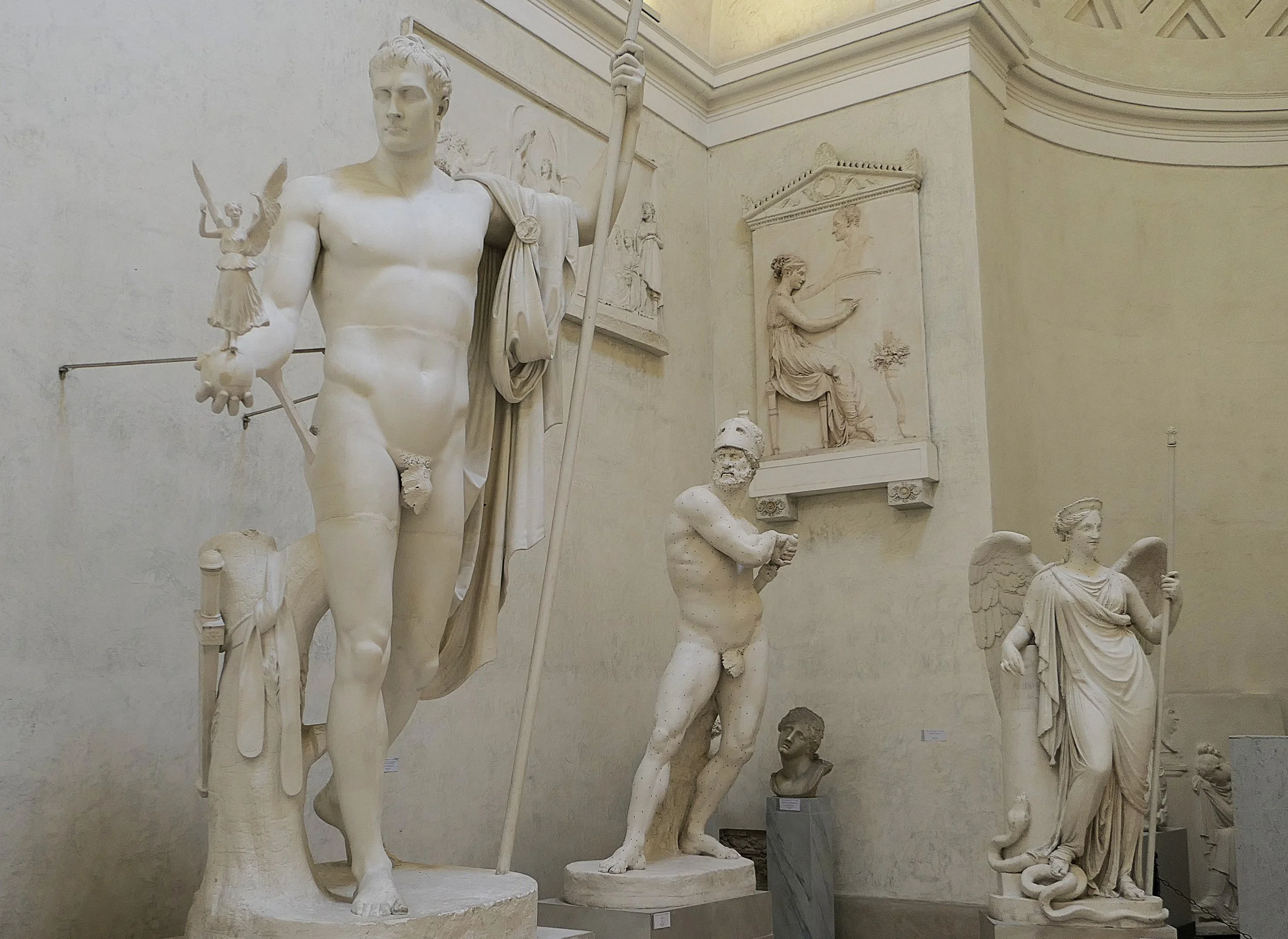 One of Canova’s few failures was a monumental, eleven-foot nude marble figure of Napoleon as Mars the Peacemaker. Napoleon commissioned it in 1802, after the short-lived Treaty of Amiens. When the short, rather portly Emperor saw the finished piece, he exclaimed “too athletic!”, and banned its display. The marble’s now at Apsley House in London, in what was the Duke of Wellington’s entry stairwell. (Vae Victis – “Woe to the Vanquished”, as the Roman Legionnaires use to say.) The plaster original is in the Gypsotheca.